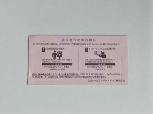 北浜キャピタルパートナーズの議決権行使でクオカード500円分が届きました。(25.8月上旬頃)