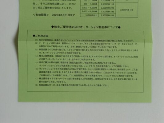 優待制度・基準日 保有株式数 株主ご優待券 オーダーシャツ割引券