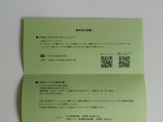 オーダーシャツ割引券はオンラインショップまたは山喜株式会社直営店舗でのパターンオーダーおよびフルオーダーのみに利用できます。