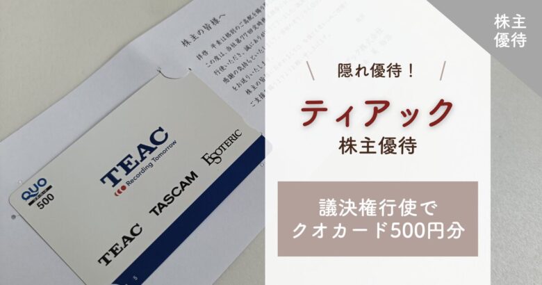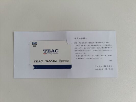 ティアック(株)の議決権行使でクオカード500円分が届きました^^(9月上旬着)