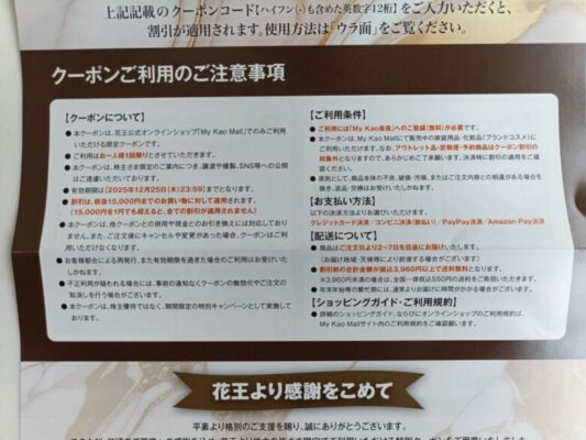 花王オンラインショップで使える20%オフクーポンが届きました^^(9月上旬着)