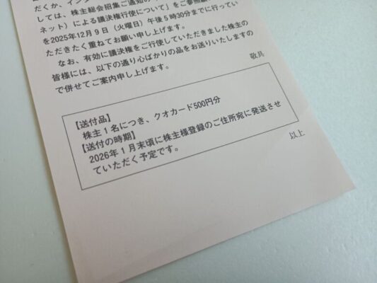 議決権行使の案内は11月末頃に届いていました。