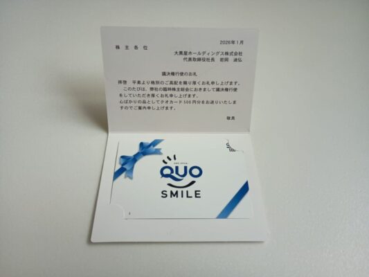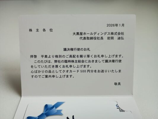 大黒屋ホールディングス(株)より議決権行使のお礼でもらえるクオカードが届きました^^(2026.1月末)